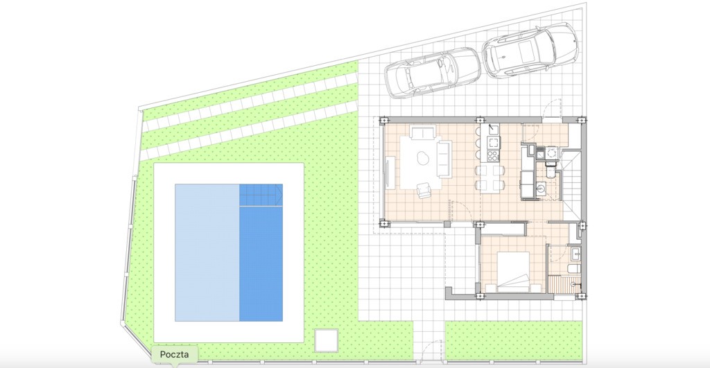 Z przodu willi znajduje się wyjątkowo duży prywatny basen (38 m²), miejsce parkingowe oraz ogród.
