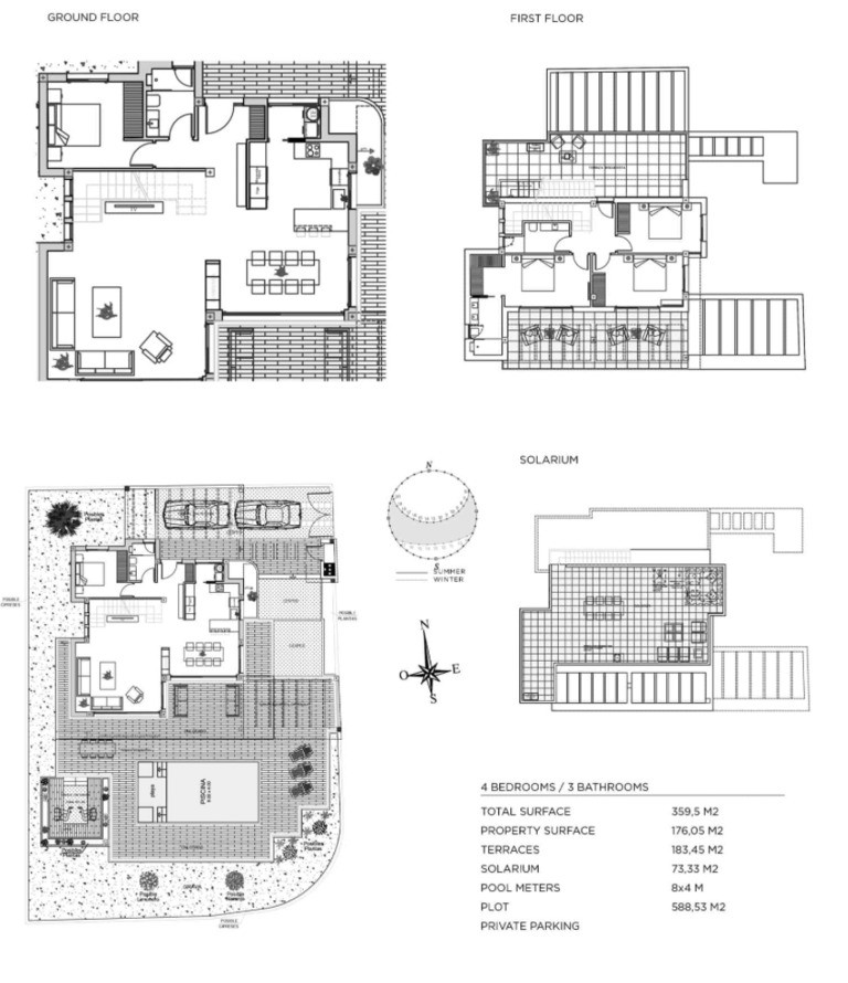 Willa oferuje przestronny układ pomieszczeń, w tym 4 sypialnie i 3 łazienki, doskonale doświetlony salon połączony z nowoczesną kuchnią, a także prywatny basen i duże solarium z widokami na okolicę. Pięć tarasów zapewnia mnóstwo przestrzeni do relaksu na świeżym powietrzu.