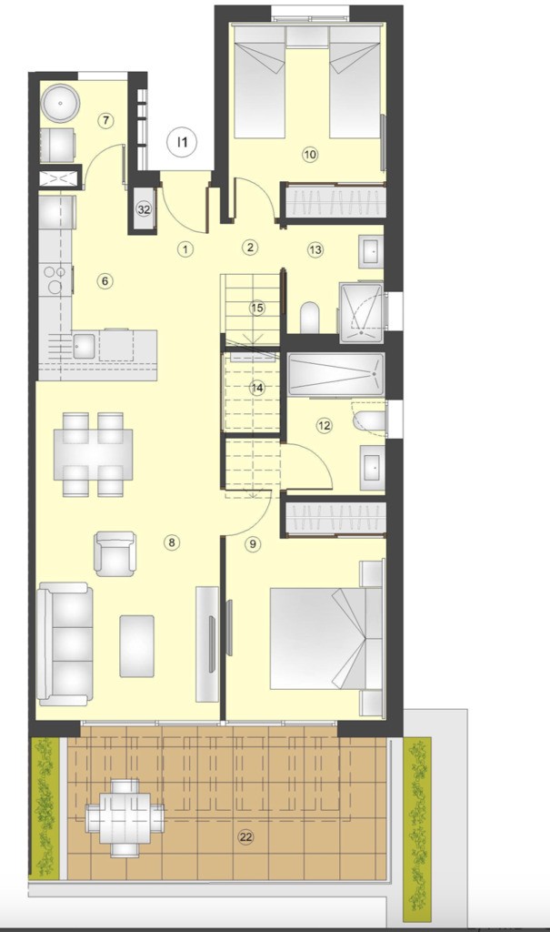 Oferta dotyczy apartamentu na 1 piętrze typu bungalow, z tarasem i solarium na dachu. W inwestycji znajdują się nieruchomości również o innych rozkładach i powierzchni - apartamenty, bungalow i wille.