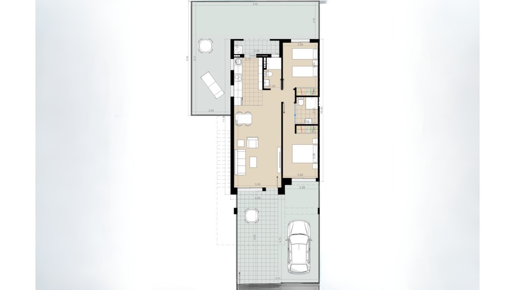 - miejsce parkingowe oraz niewielki taras dostępny z salonu połączonego z przestrzennym aneksem kuchennym. Całość objęta zabudową oraz bramą oddzielającą bezpiecznie teren apartamentu,